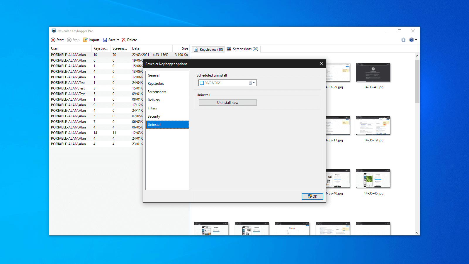 Keystrokes tab Screenshots tab Options General Options Screenshots Options Delivery Options Filters Options Security Options Uninstall
